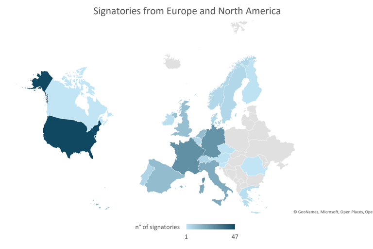 This visualisation portrays the geographical distribution of companies that have signed the pledges introduced by the AI Pact, focusing on the two regions with the highest number of signatories: Europe and North America.